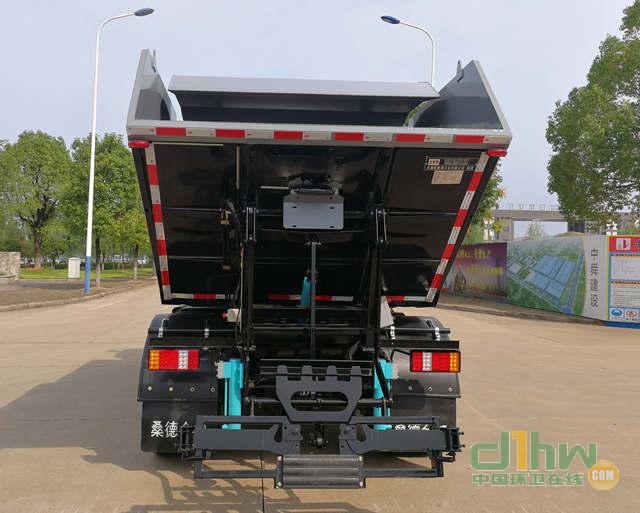 選用3500mm軸距底盤,裝有ABS,型號:DETC-ABS-4S/4M;生產廠家:東風電子科技股份有限公司汽車制動系統公司.動力蓄電池種類為三元鋰蓄電池,生產企業為桑頓新能源科技有限公司,驅動電機類型為永磁同步電機,型號為TZ290XS065M0701,額定功率為65kW,峰值功率為110kW,生產企業為湖南意譜電動系統有限公司;電機控制器型號為KTZ37X40S10C,生產企業為湖南意譜電動系統有限公司;側面防護裝置由電池罩及防護欄組成,防護欄材質為鋁合金,連接方式為螺栓連接,后部防護裝置由專用裝置代替,材質為Q235A,離地高度為260mm.專用裝置由翻桶機構,垃圾箱等組成,通過翻桶機構將桶裝垃圾傾倒在廂體內進行轉運作業.產品技術階段:發展期;銷售區域:可全國銷售.