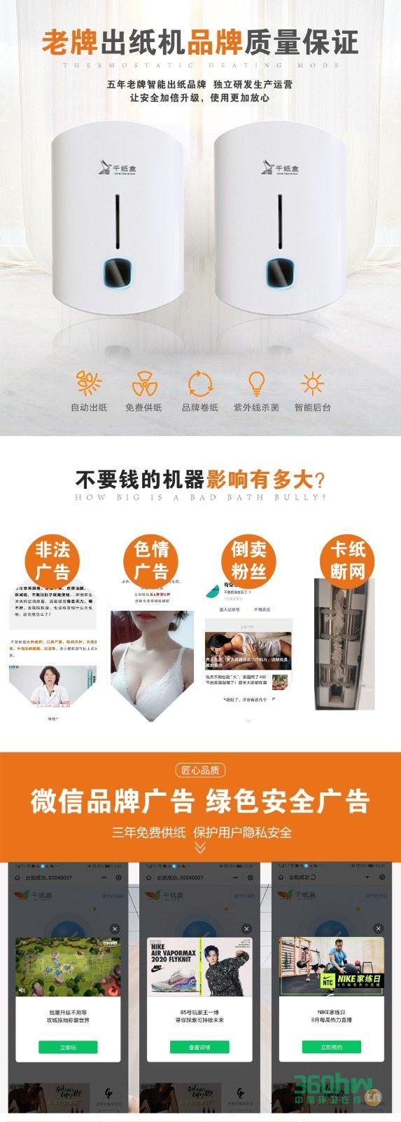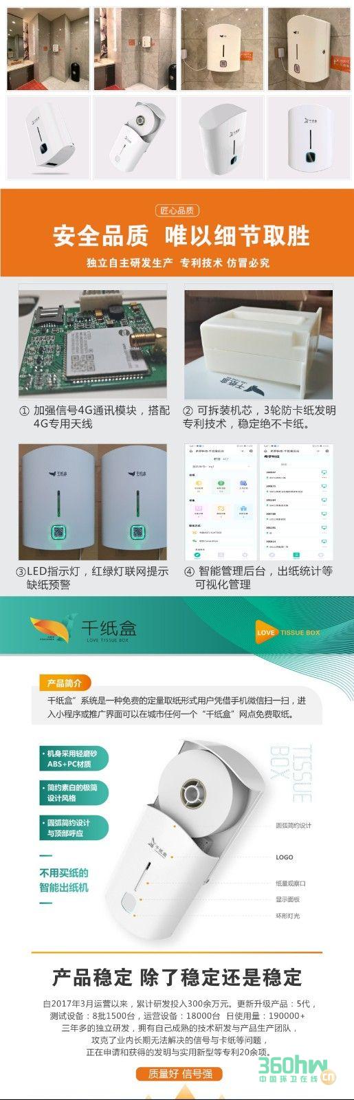 “ 千紙(zhi)(zhi)盒(he)”是一款(kuan)基于(yu)(yu)環保、便民為(wei)(wei)理念的免(mian)(mian)費(fei)智能供(gong)紙(zhi)(zhi)產品(pin)。一次購買設備,三年免(mian)(mian)費(fei)供(gong)紙(zhi)(zhi),為(wei)(wei)場景(jing)方(fang)節約(yue)購紙(zhi)(zhi)成(cheng)本。我們(men)將人(ren)工智能、移動(dong)互(hu)聯(lian)良好的應用于(yu)(yu)實(shi)際,同時(shi)兼顧(gu)平臺粉(fen)絲與政府公益宣傳相結合的方(fang)式(shi)為(wei)(wei)用戶提供(gong)免(mian)(mian)費(fei)用紙(zhi)(zhi)服務(wu),單次出紙(zhi)(zhi)長度(du)控制在80公分左右,單人(ren)每日可出紙(zhi)(zhi)5次,旨在引導培養人(ren)們(men)養成(cheng)節約(yue)用紙(zhi)(zhi)的良好習(xi)慣。